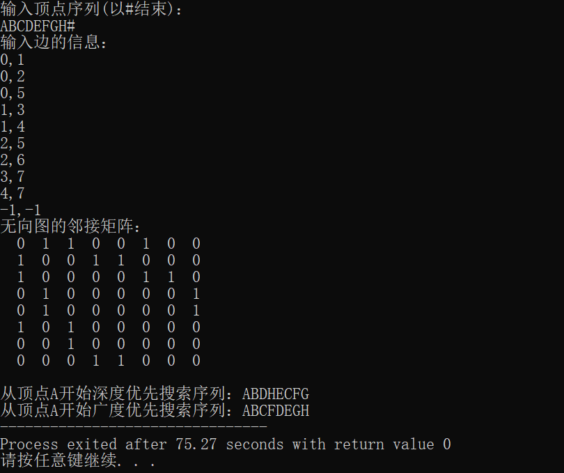 通过本次实验,掌握图的邻接矩阵和邻接表表示、图的深度优先和广度优先搜索方法和图的应用方法。