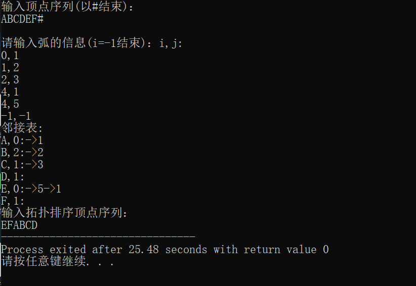 3、拓扑排序:对一个有向无环图G进行拓扑排序,是将G中所有顶点排成一个线性序列,使得图中任意一对顶点u和v,若边<u,v>∈E(G),则u在线性序列中出现
