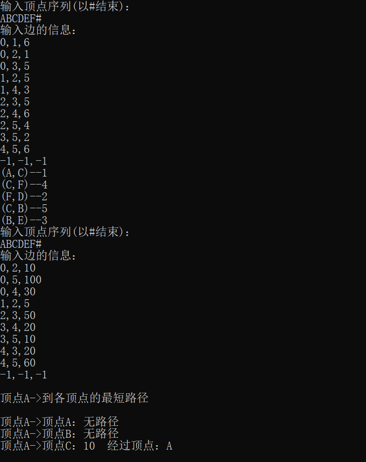 下面的输入分别验证prim算法和dijstra算法。输入实例的第一部分为无向图,求其最小生成树;输入的第二部分为有向图,求其最短路径。