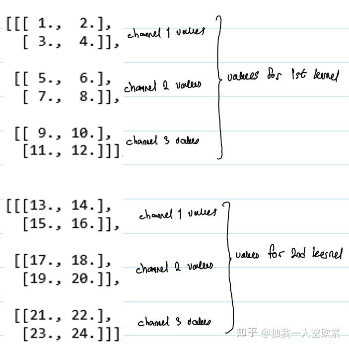 再来看看卷积核,这里我认为你已经十分明确了解卷积核的概念。重复一次,对于3输入2输出的要求,应该有3*2=6个卷积核。