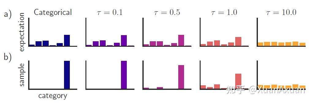下面这幅图将原Categorical分布与Gumbel-Softmax分布进行了对比(只有第一列是Categorical分布),可以看出,当 𝜏 很小时,Gumbel-Softmax与原分布十分接近,采样得到的结果也与原分布相同,当 𝜏 比较大时,各个动作的概率就会趋近于相等。在实验中,需要对 𝜏 进行合理地选取。