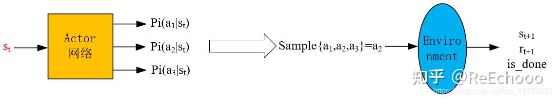 以上是离散动作的情况,如果是连续动作,就输出概率分布的参数(比如高斯分布的均值和方差),然后按照概率分布去采样得到动作 𝑎𝑡 .