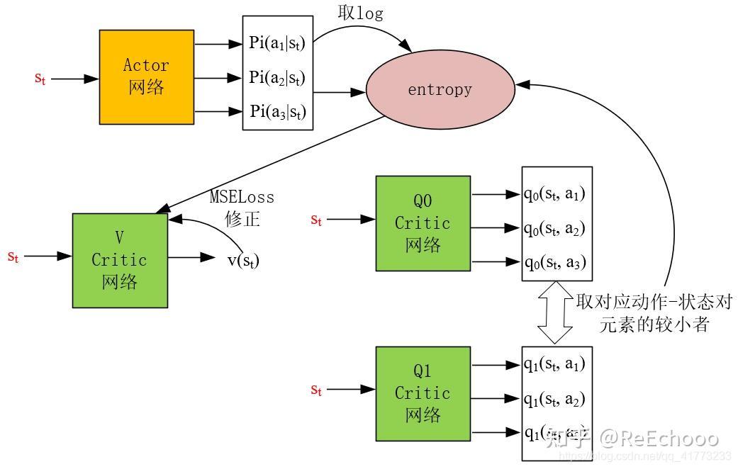 如果 V critic网络 输出的状态价值 𝑣 越准确,那么就越好。但需要注意的是,因为SAC中加了熵的概念,所以状态价值 𝑣 并不是我们通常理解的 𝑣(𝑠) ,它其中还加了熵这一项。