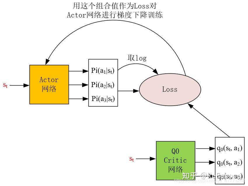 可以看到 𝜋(𝑎𝑡′|𝑠𝑡;𝜃) 、 𝑞0(𝑠𝑡,𝑎𝑡′;𝑤(0)) 、 ln𝜋(𝑎𝑡′|𝑠𝑡;𝜃) 这三项和图中的Loss三个输入箭头完全一致。需要注意的是 𝑞0(𝑠𝑡,𝑎𝑡′;𝑤(0)) 可以用 𝑞1(𝑠𝑡,𝑎𝑡′;𝑤(1)) 替换,这两个Q critic网络在功能上是等价的。