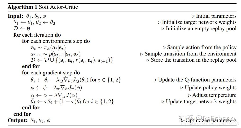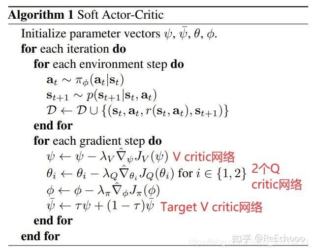 一篇是《Soft Actor-Critic: Off-Policy Maximum Entropy Deep Reinforcement Learning with a Stochastic Actor》,2018年1月挂arXiv,其中SAC算法流程如下所示,它包括1个actor网络,2个V Critic网络(1个V Critic网络,1个Target V Critic网络),2个Q Critic网络: