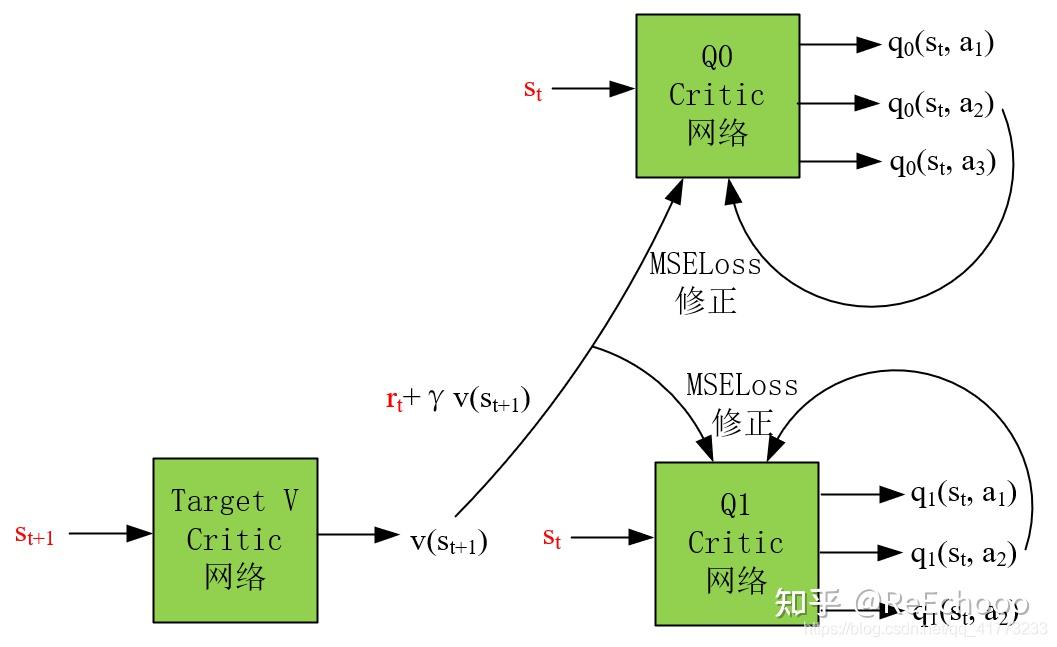 一个actor网络,四个critic网络,分别是状态价值估计 𝑣 和Target 𝑣 网络;动作-状态价值估计 𝑄0 和 𝑄1 网络。