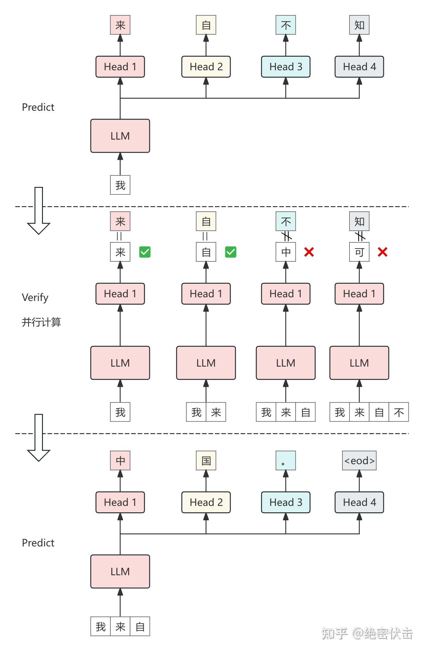- 阶段 3: Accept,将上下文和通过验证的 token concat,构成新的上下文["我", "来", "自"],然后继续重复上面的步骤。