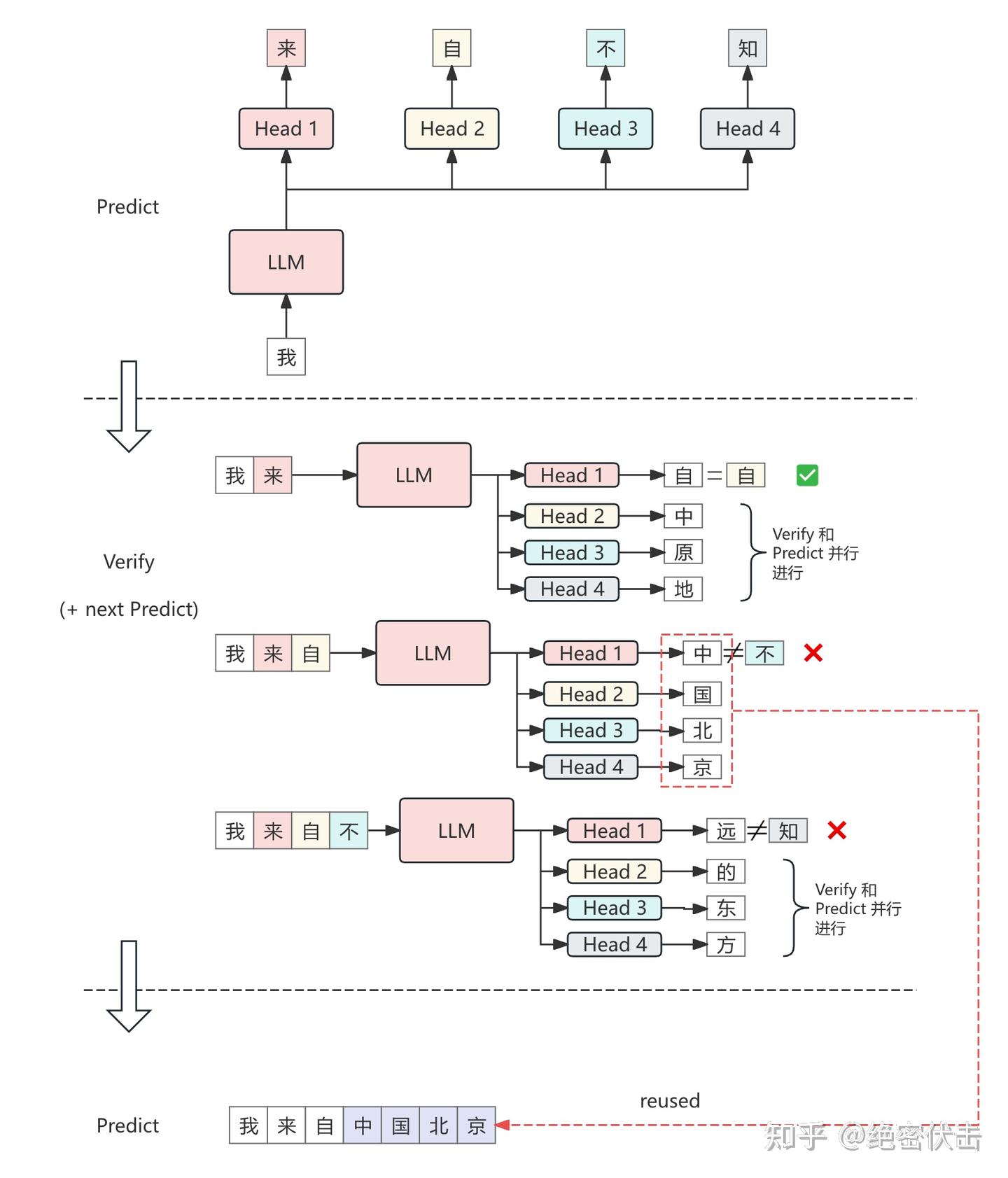 在验证完成后,下一次预测无需再次调用模型,而是直接复用上一步已经生成好的 𝑘 个候选 token,例如“我来自中国北京”。