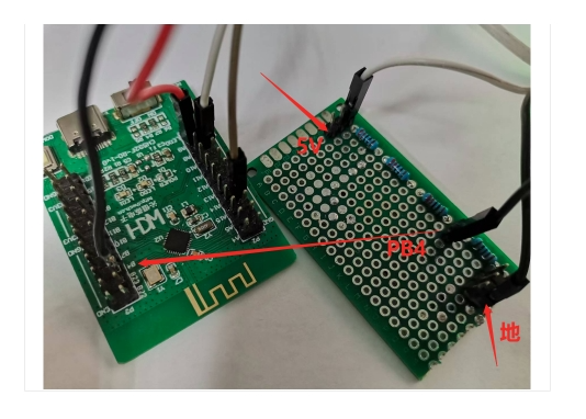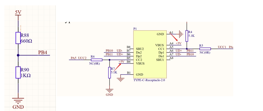 最简单的方式就通过硬件检测,将USB的5V输入脚引出来,然后通过电阻分压的方式,把CH592拉出来一个GPIO脚接上,通过GPIO的外部中断来进行唤醒和睡眠操作,当USB设备接入到主机时该引脚上产生了从低电平变到高电平的状态,从而判断为USB设备接入,芯片唤醒,USB设备工作。当高电平转换到低电平的时候,此时判断USB设备拔出,芯片又重新进入低功耗模式。
