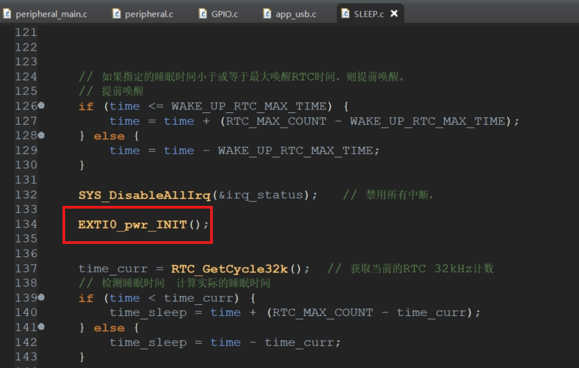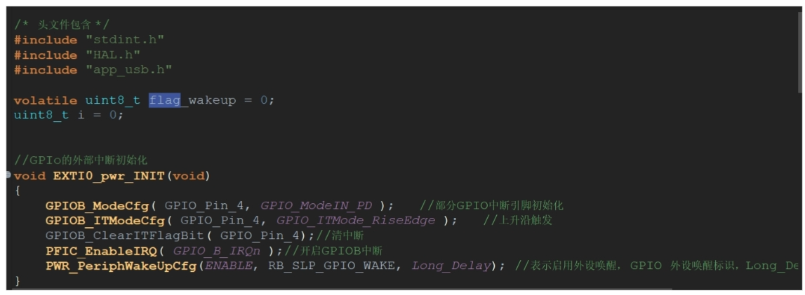 在低功耗睡眠函数中,通过判断flag_wakeup这个标志位,当这个上升沿触发后,flag_wakeup标志位为1,说明USB设备已经插入,这个时候就直接退出低功耗状态,不进行休眠。并将GPIO外部中断函数初始化,配置GPIO中断唤醒源为PB4.