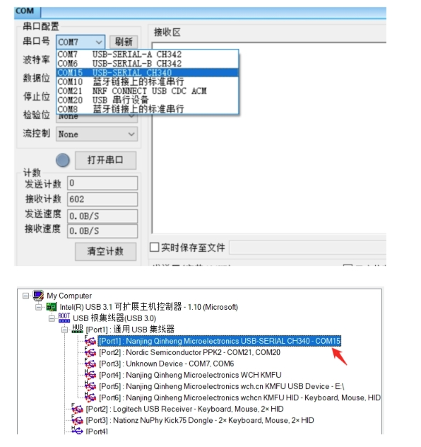 当USB插入后,可以明显看到功耗上升,蓝牙唤醒。通过串口调试工具可以看到COM15口,COM15模拟出一个CH340设备,这样就可以与蓝牙进行透传数据。