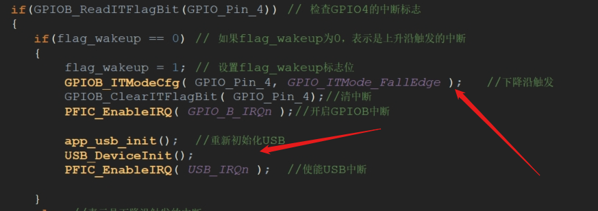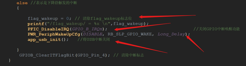 在下降沿中断里,先将flag_wakeup标志位清除,退出唤醒状态。然后关闭GPIOB的中断功能,也关闭GPIO中断唤醒功能,并且重新初始一下app_usb_init();,为了将USB中断失能,不能让USB干扰蓝牙的低功耗睡眠状态。