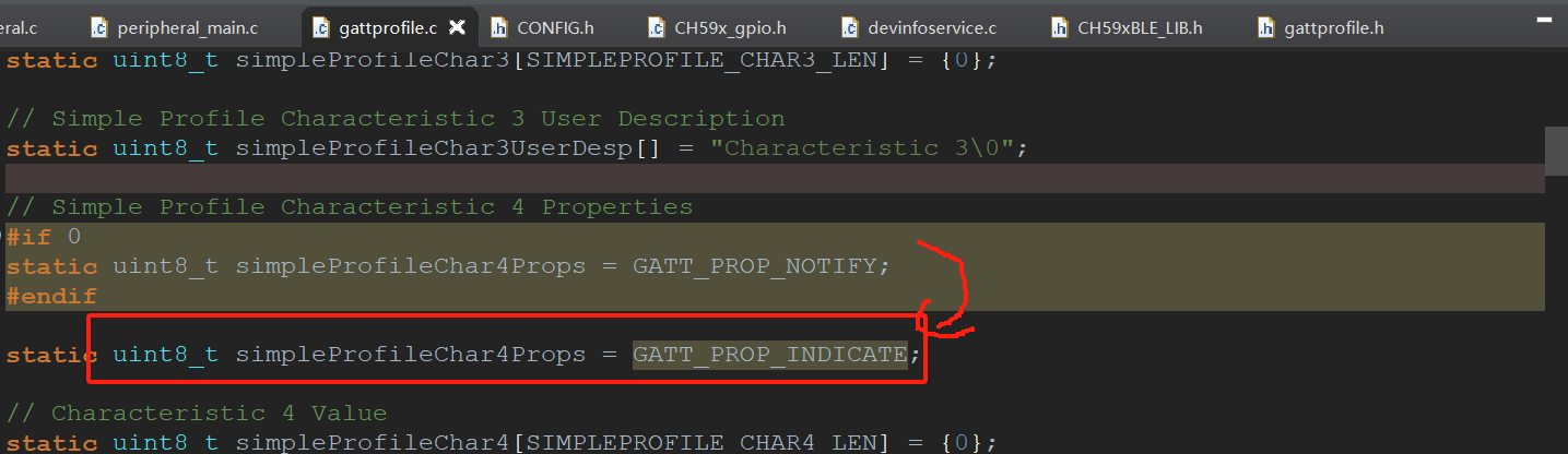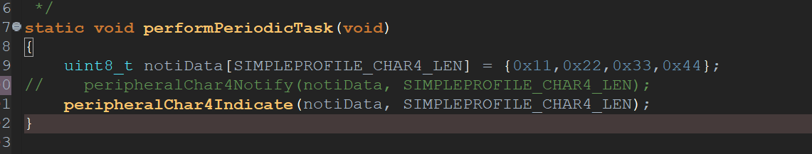 三、在peripheral.c文件中,添加修改indication属性数据函数,根据peripheralChar4Notify函数重新添加一个peripheralChar4Indicate函数