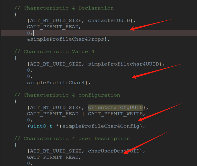 在特征定义表格中,特征值4的读写属性中,与Notify的配置的属性表一样