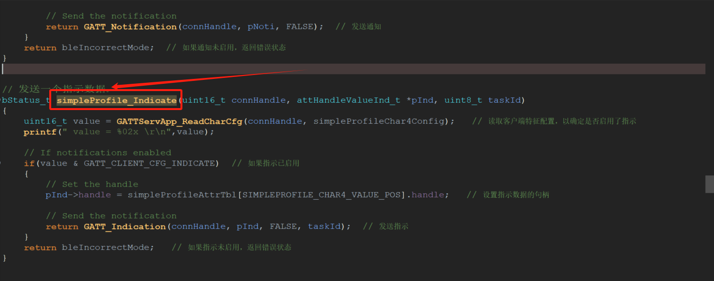 bStatus_t simpleProfile_Indicate(uint16_t connHandle, attHandleValueInd_t *pInd, uint8_t taskId) { uint16_t value = GATTServApp_ReadCharCfg(connHandle, simpleProfileChar4Config); // 读取客户端特征配置,以确定是否启用了指示 printf(" value = %02x \r\n",value); // If notifications enabled if(value & GATT_CLIENT_CFG_INDICATE) // 如果指示已启用 { // Set the handle pInd->handle = simpleProfileAttrTbl[SIMPLEPROFILE_CHAR4_VALUE_POS].handle; // 设置指示数据的句柄 // Send the notification return GATT_Indication(connHandle, pInd, FALSE, taskId); // 发送指示 } return bleIncorrectMode; // 如果指示未启用,返回错误状态 }
