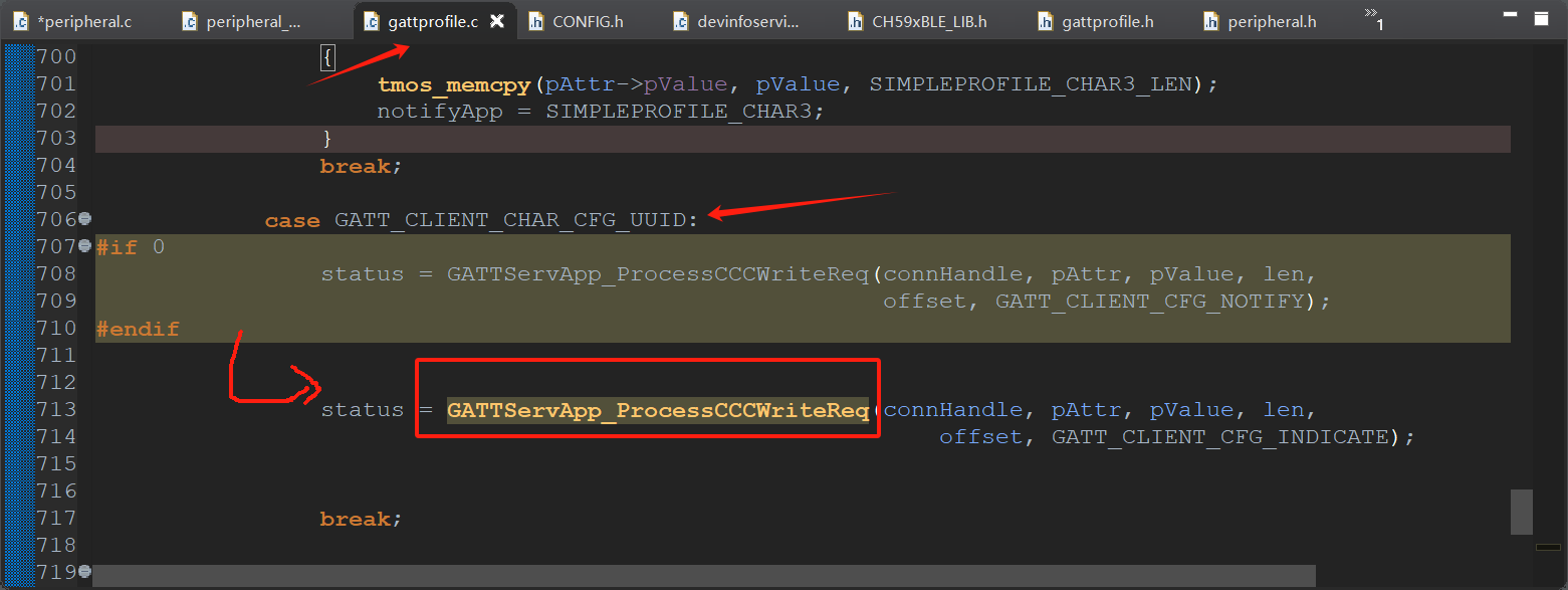 在gattprofile.c中simpleProfile_WriteAttrCB写操作中进行修改,改为GATT_CLIENT_CFG_INDICATE