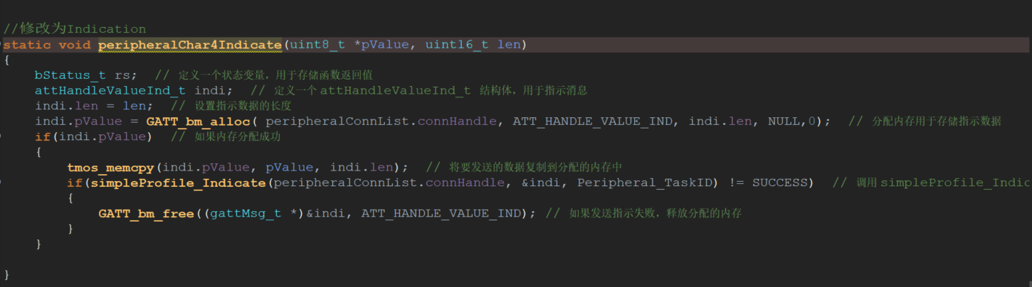 //修改为Indication static void peripheralChar4Indicate(uint8_t *pValue, uint16_t len) { bStatus_t rs; // 定义一个状态变量,用于存储函数返回值 attHandleValueInd_t indi; // 定义一个 attHandleValueInd_t 结构体,用于指示消息 indi.len = len; // 设置指示数据的长度 indi.pValue = GATT_bm_alloc( peripheralConnList.connHandle, ATT_HANDLE_VALUE_IND, indi.len, NULL,0); // 分配内存用于存储指示数据 if(indi.pValue) // 如果内存分配成功 { tmos_memcpy(indi.pValue, pValue, indi.len); // 将要发送的数据复制到分配的内存中 if(simpleProfile_Indicate(peripheralConnList.connHandle, &indi, Peripheral_TaskID) != SUCCESS) // 调用 simpleProfile_Indicate 函数发送指示 { GATT_bm_free((gattMsg_t *)&indi, ATT_HANDLE_VALUE_IND); // 如果发送指示失败,释放分配的内存 } } }