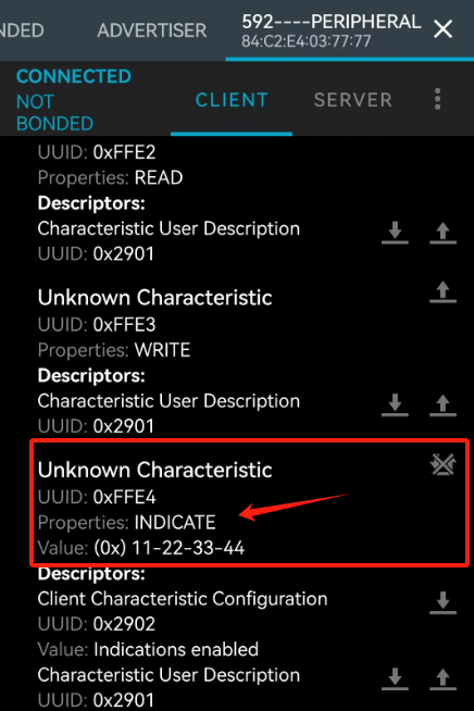 将修改好的从机程序烧录程序在芯片中,用NRF_CONNECT调试工具连接,在UUID为0xFFE4上,可以看到具有Indication属性,并且能够获取到从机Indication属性发送的数据(0x11,0x22,0x33,0x44)