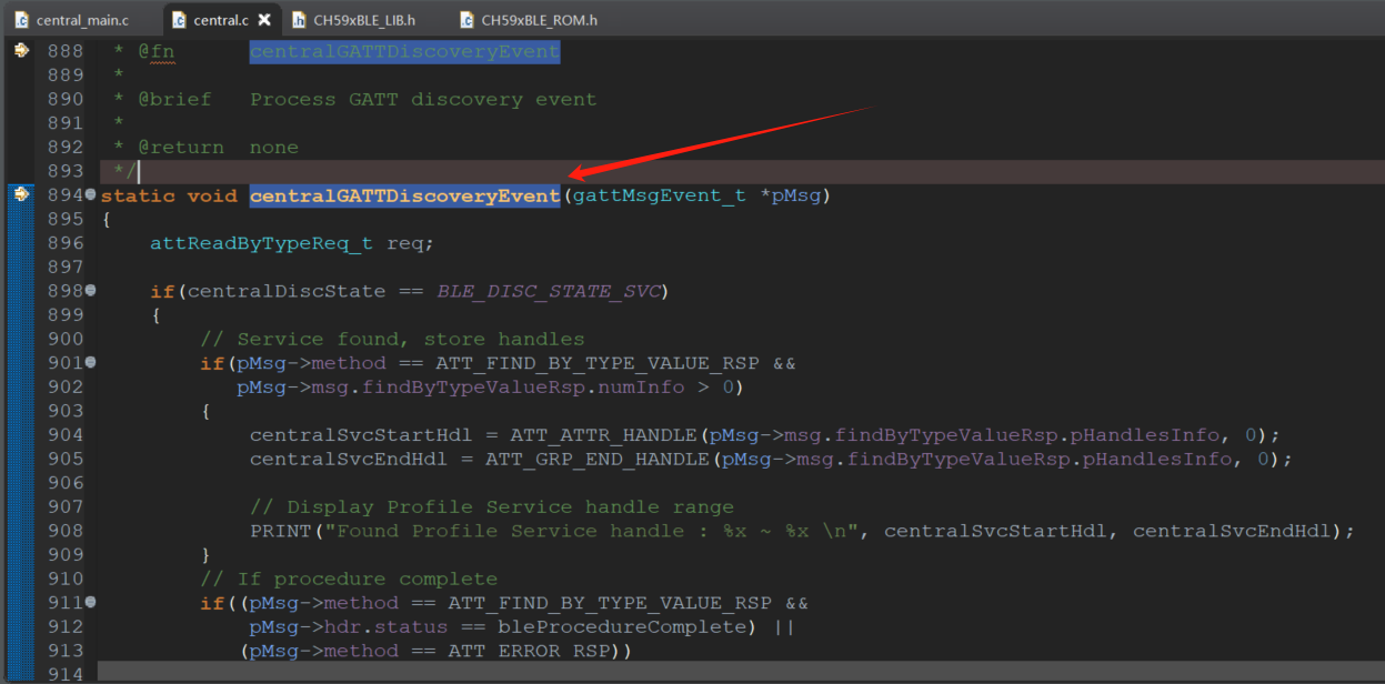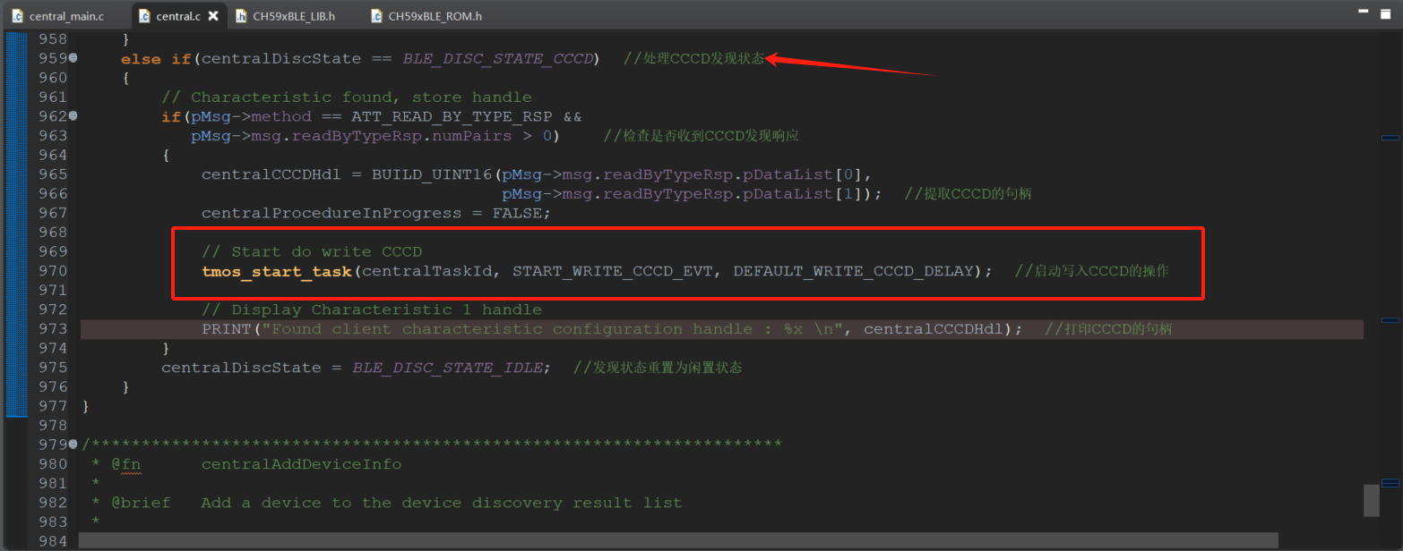 在主机程序中,连接从机之后,进行枚举服务,使能启动写入CCCD操作