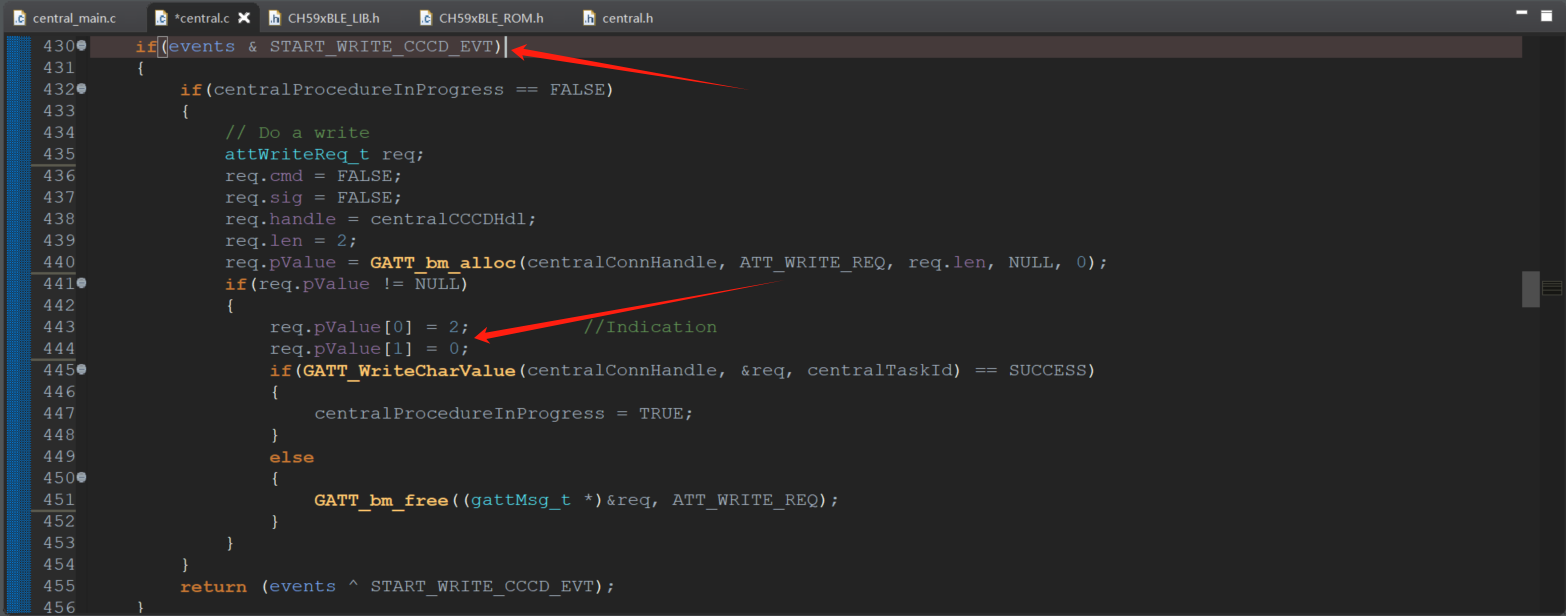 在TMOS事件中,对CCCD写入操作中,按照接收NOTIFY的程序改造一下,其中更具协议规定, 将req.pValue的值得更改。
