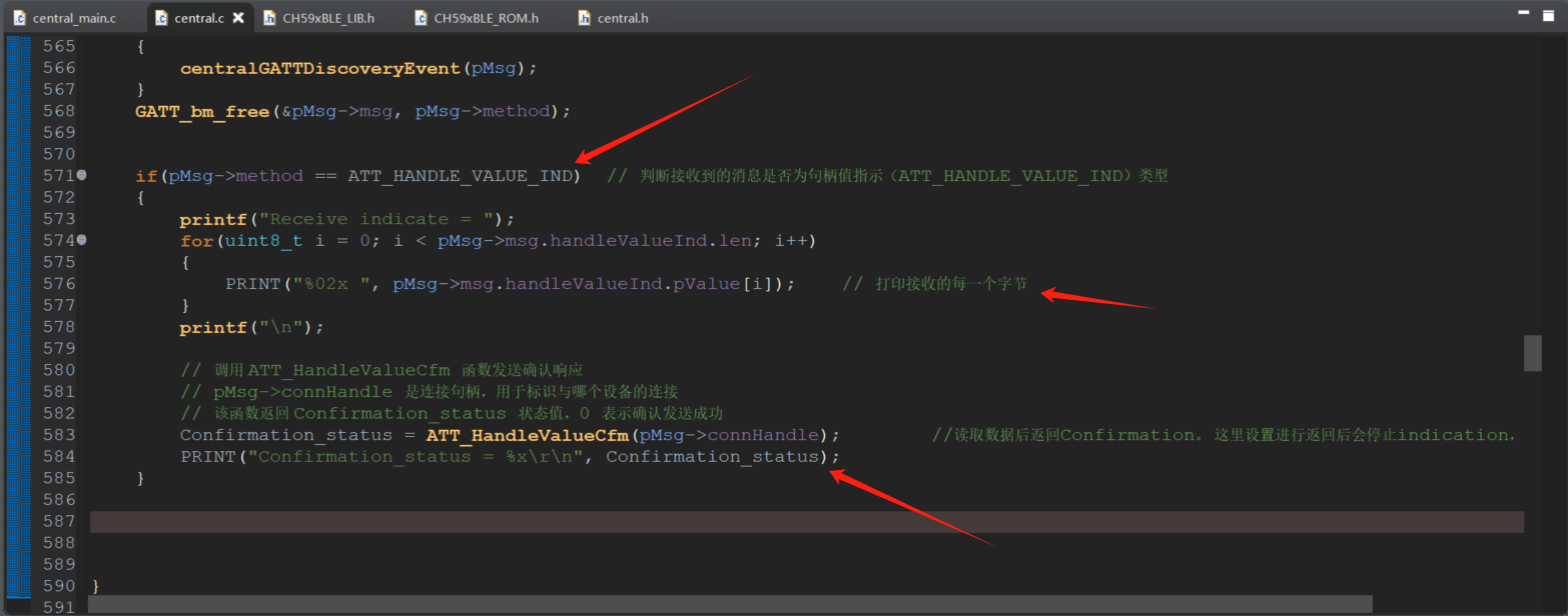在centralProcessGATTMsg函数中,添加接收Indication数据,并打印每一个字节,接收完数据之后,由于Indication属性在发送完数据之后,就得进行回应确认状态,所以调用 ATT_HandleValueCfm 函数发送确认响应。函数返回 Confirmation_status 状态值,0 表示确认发送成功。