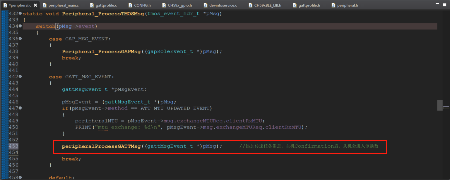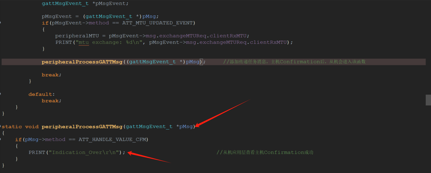 添加传递任务消息函数,主机Confirmation应答回复后,从机会进入peripheralProcessGATTMsg函数,进行确认。