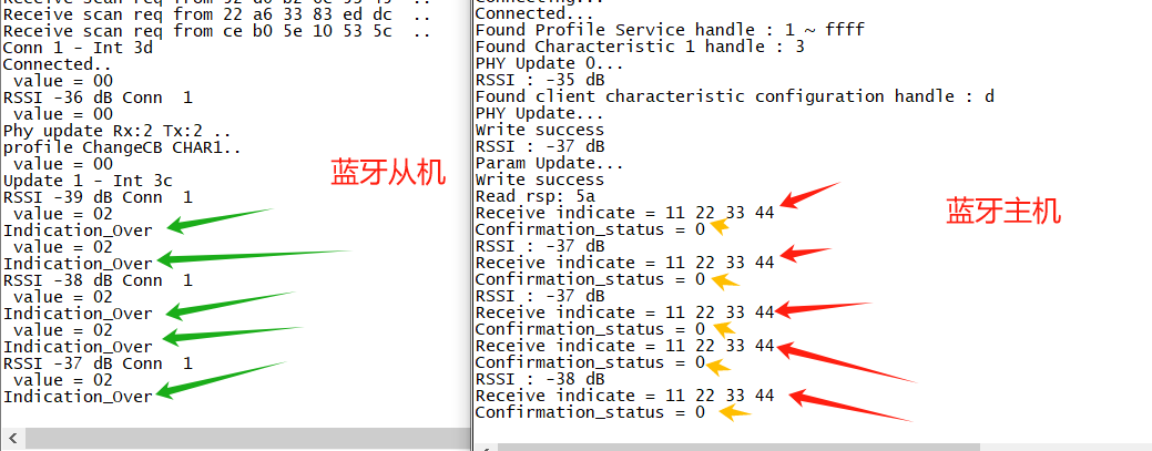 在从机程序中, 也可以添加函数,进行接收主机已经接收到Indication属性数据的应答操作,从而从机进行下一包的数据的发送。
