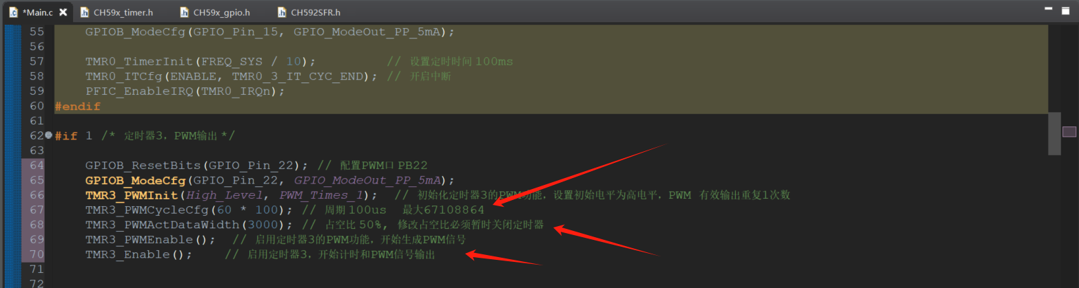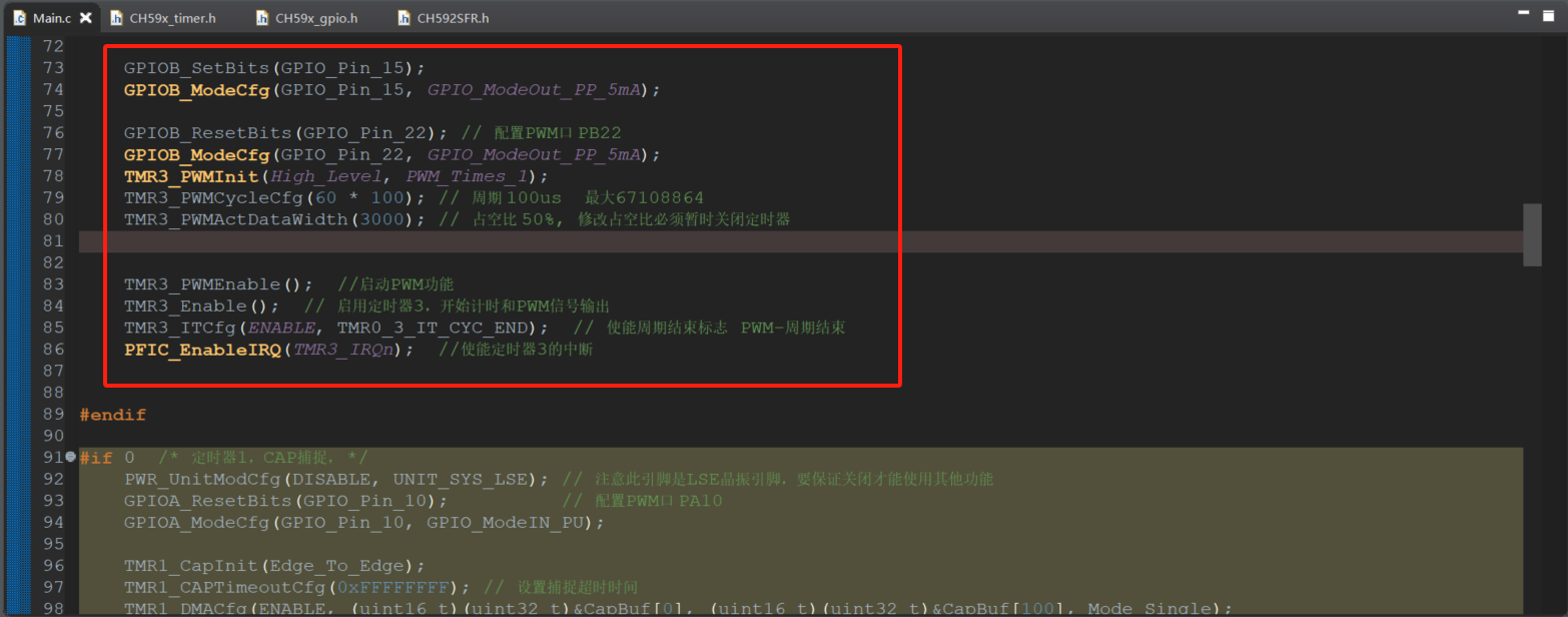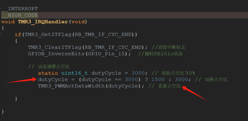 GPIOB_SetBits(GPIO_Pin_15); GPIOB_ModeCfg(GPIO_Pin_15, GPIO_ModeOut_PP_5mA); GPIOB_ResetBits(GPIO_Pin_22); // 配置PWM口 PB22 GPIOB_ModeCfg(GPIO_Pin_22, GPIO_ModeOut_PP_5mA); TMR3_PWMInit(High_Level, PWM_Times_1); TMR3_PWMCycleCfg(60 * 100); // 周期 100us 最大67108864 TMR3_PWMActDataWidth(3000); // 占空比 50%, 修改占空比必须暂时关闭定时器 TMR3_PWMEnable(); //启动PWM功能 TMR3_Enable(); // 启用定时器3,开始计时和PWM信号输出 TMR3_ITCfg(ENABLE, TMR0_3_IT_CYC_END); // 使能周期结束标志 PWM-周期结束 PFIC_EnableIRQ(TMR3_IRQn); //使能定时器3的中断 __INTERRUPT __HIGH_CODE void TMR3_IRQHandler(void) { if(TMR3_GetITFlag(RB_TMR_IF_CYC_END)) { TMR3_ClearITFlag(RB_TMR_IF_CYC_END); //清除中断标志 GPIOB_InverseBits(GPIO_Pin_15); //翻转PB15io状态 // 动态调整占空比 static uint16_t dutyCycle = 3000; // 初始占空比 50% dutyCycle = (dutyCycle == 3000) ? 1500 : 3000; // 切换占空比 TMR3_PWMActDataWidth(dutyCycle); // 更新占空比 } }