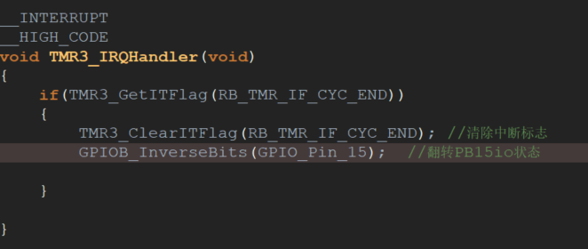 在原有的例程上进行修改程序,添加定时3中断使能,并且将中断标志设置为PWM周期结束标志。在中断服务函数中进行翻转PB15的IO口电平状态。