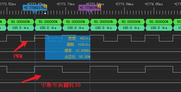 通过逻辑分析仪,可以看到占空比波形,可以观察到PWM输出一个周期之后,PB15从低电平到高电平,第二个周期结束之后,PB15从高电平到低电平