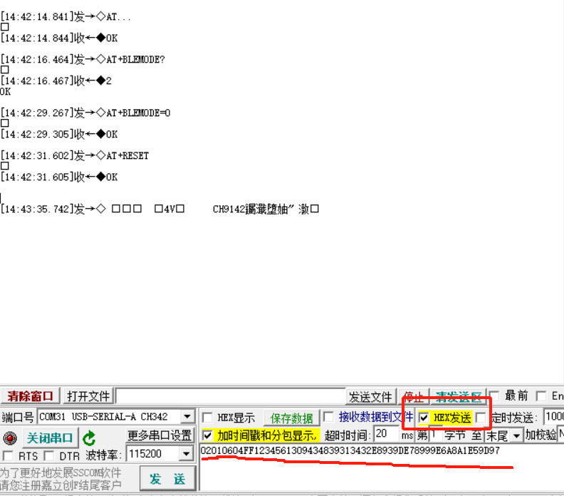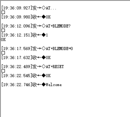发→◇AT+BLEMODE=0 //设置模式的参数 x 为:0(广播模式)、1(主机模式)、2(设备模式)