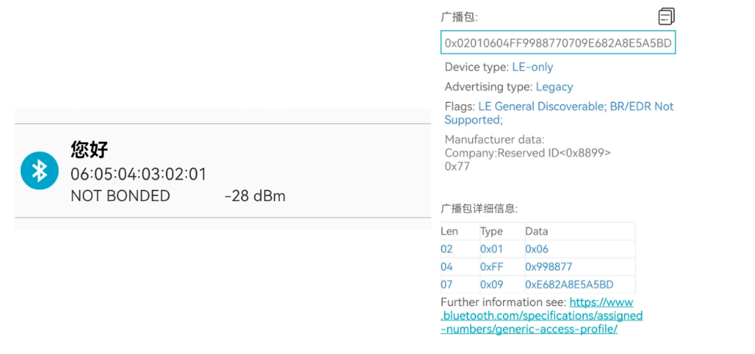 07+09+E682A8E5A5BD:07是数据长度,0x09是广播名称类型,0xE682A8E5A5BD是中文”您好“的编码
