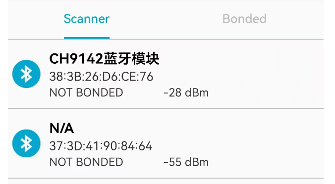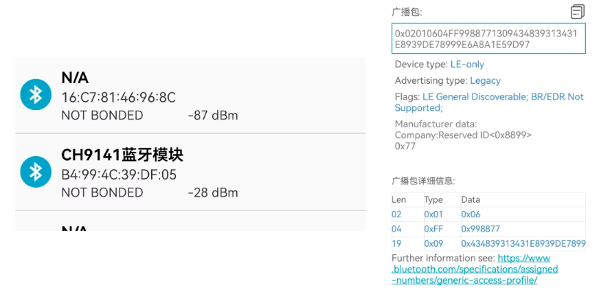 通过BLE调试助手,扫描到CH9141的广播包的信息,