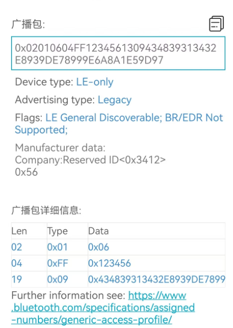 02+01+06:02是数据长度,0x01是蓝牙广播类型,0x06是表示广播的模式,设置为普通可发现模式和不支持经典蓝牙,只支持低功耗蓝牙,具体的 蓝牙广播模式可以参考蓝牙协议规范。也可以直接参考这个广播数据发送。
