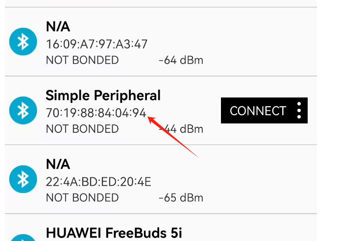 通过BLE调试助手可以观察到,在主机端传入的mac地址要注意大小端问题,所以这个蓝牙从机的MAC地址是 70 19 88 84 04 94。所以在串口日志输出的chip UID:94 04 84 88 19 70 31 fd中,前六个字节是以小端存储的,需要将第六个字节作为蓝牙MAC地址的第一个字节,依此排列,第一个字节也就是蓝牙MAC地址的最后一个字节,即第六个字节。