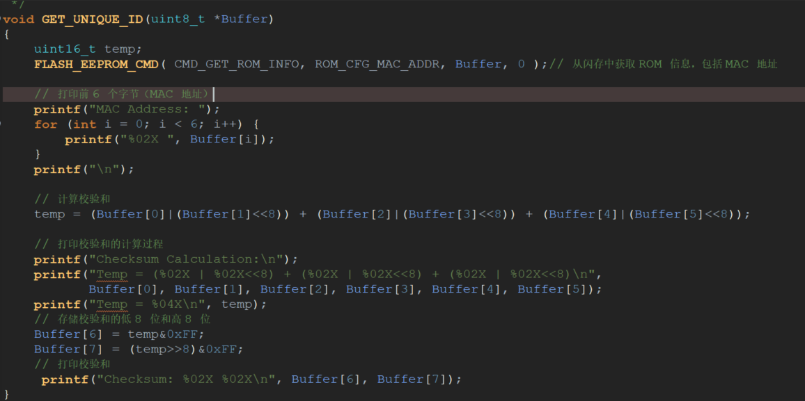 在这个程序中, 我们可以观察这个通过FLASH_EEPROM_CMD函数中,读取到MAC地址信息, 然后再计算校验和,从 Buffer 中取出前6个字节(即MAC地址的6个字节),分别将每两个字节组合成一个16位的整数。将这三个16位整数相加,得到一个累加和 temp,然后存储校验和,将累加和 temp 的低8位存储在 Buffer[6] 中。将累加和 temp 的高8位存储在 Buffer[7] 中。
