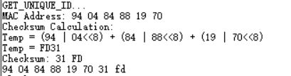 chip UID:94 04 84 88 19 70 31 fd ,这个chip UID输出的前六个字节芯片的内部的唯一MAC地址,最后两位是校验位。