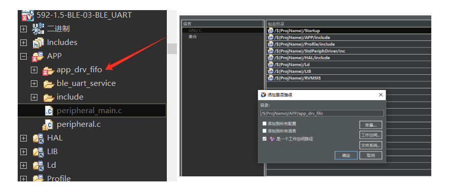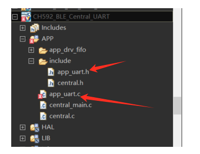 第一、先将BLE_UART中的环形FIFO(先进先出)缓冲区的程序复制移植到主机中,app_drv_fifo是用于管理串口数据的临时存储和读取,并且相对应的路径。