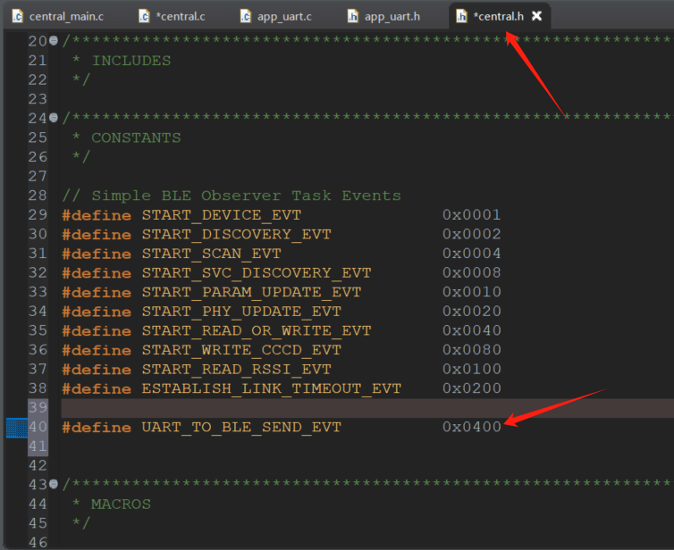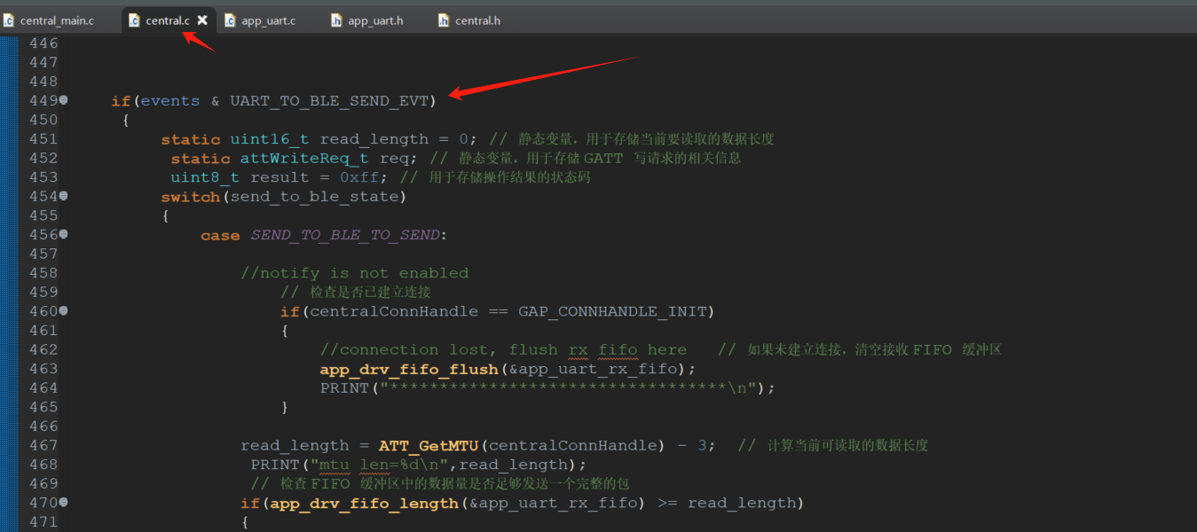 在central.h中,进行UART_TO_BLE_SEND_EVT的任务注册定
