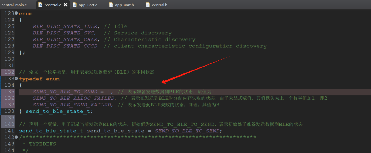 并定义一个枚举类型,用于表示发送到蓝牙(BLE)的不同状态