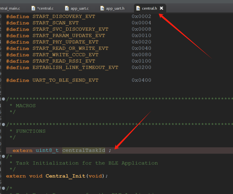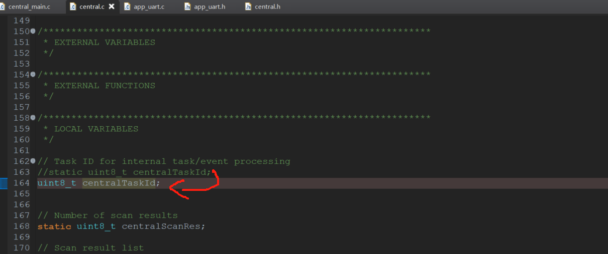 static 关键字表示该变量的作用域仅限于当前文件,不会被其他文件直接访问, 但是在app.uart程序中有使用任务ID,所以需要将centralTaskId在central.h声明一下。