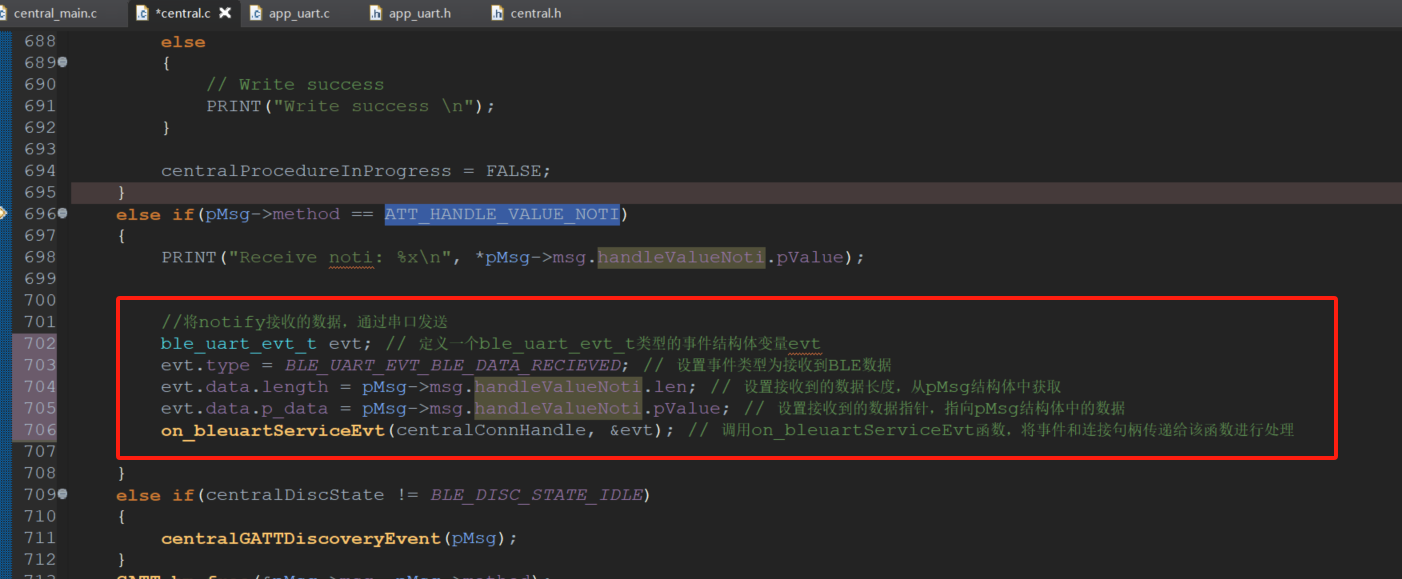 得在主机程序中的,接收notify数据的地方,将接收发数据,通过调用 on_bleuartServiceEvt 函数,传入BLE连接句柄 centralConnHandle 和指向 evt 的指针。将数据发送到UART