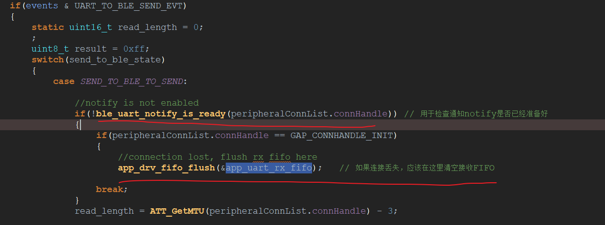 在TMOS任务中,UART_TO_BLE_SEND_EVT任务中进行蓝牙发送数据,先回判断是否notify通知是否准备好。,如果没有连接到对应的notify的handle值,就会清空接收的FIFO