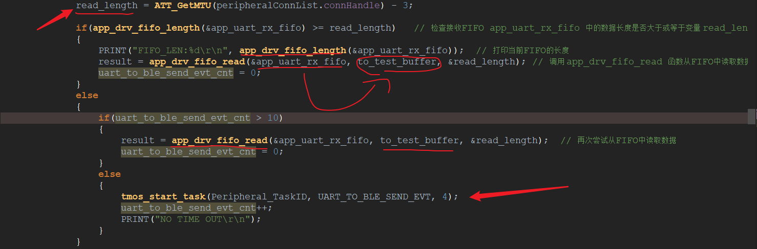 然后会判断FIFO长度,调用 app_drv_fifo_read 函数从FIFO中读取数据。读取的数据将被存储在 to_test_buffer 指向的缓冲区中