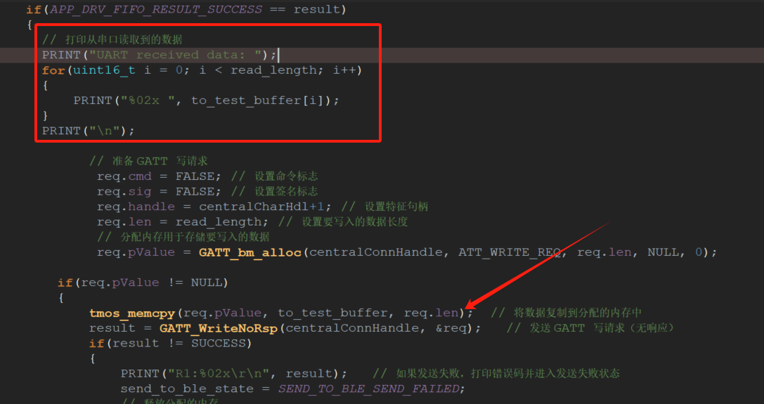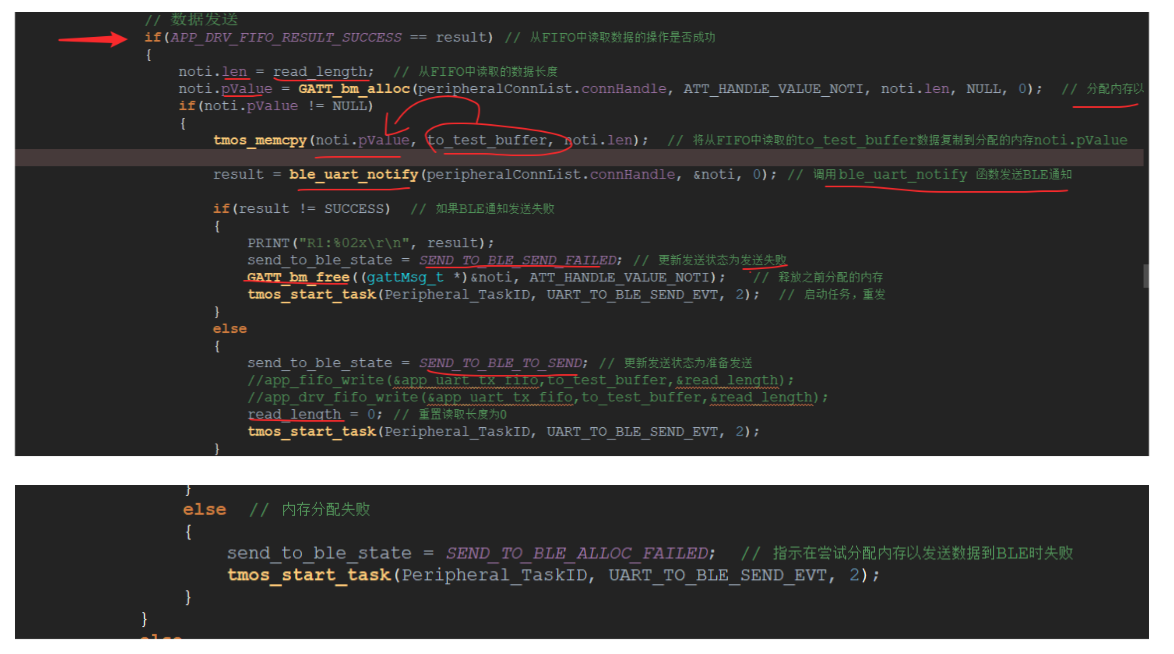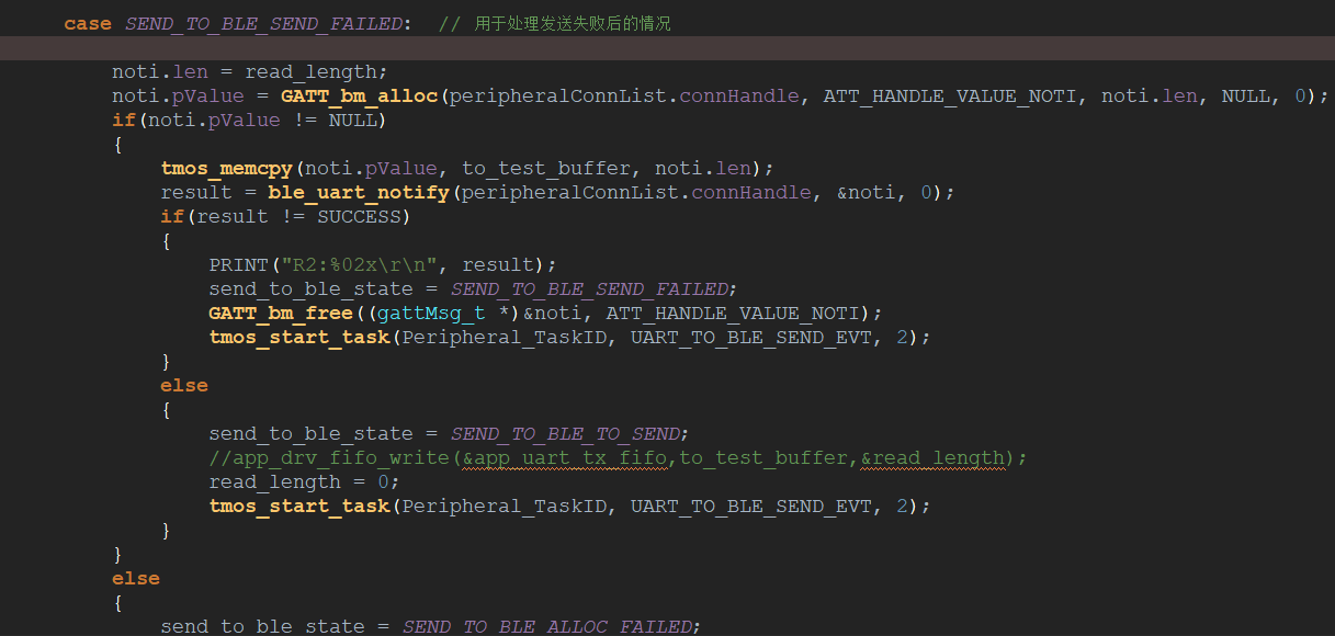 如果BLE通知发送失败,会释放之前申请的内存,重新启动任务,但是如果发送成功,会重置读取到长度。