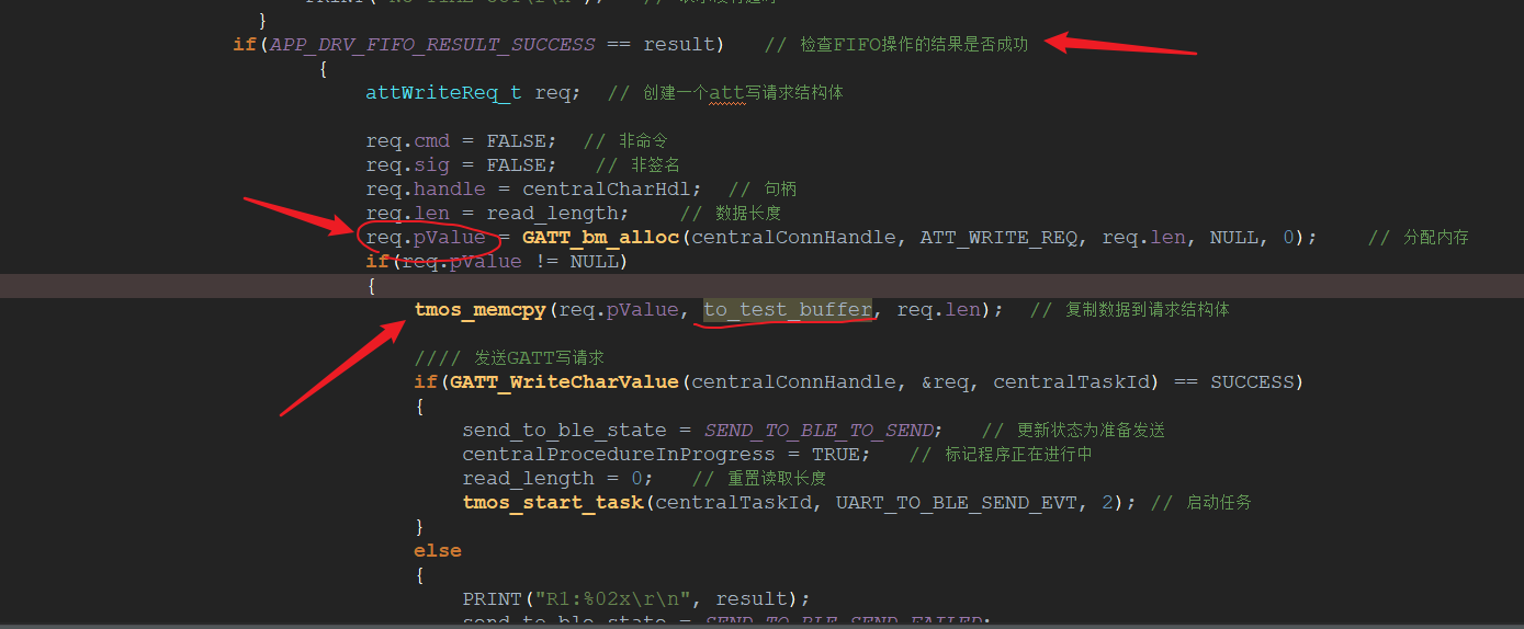 如果是发送失败的情况下,会进入到case SEND_TO_BLE_SEND_FAILED中,重新分配内存,重新从FIFO中读取的to_test_buffer数据复制到分配的内存noti.pValue。然后再进行发送蓝牙BLE通知。