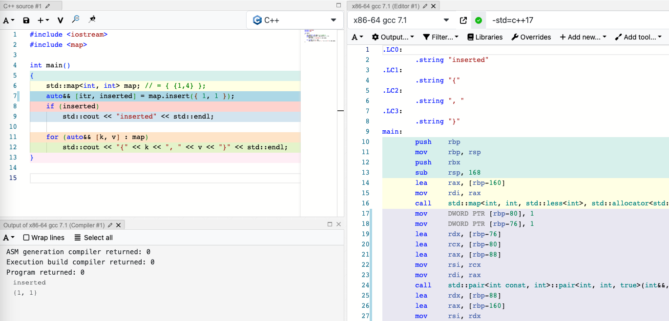 其实好多语法糖丢这里可以一眼露馅,比如上面的结构化绑定,其实在底层用的还是 std::pair,只不过编译器帮你省略了繁锁的细节,这比看反汇编是直观多了。