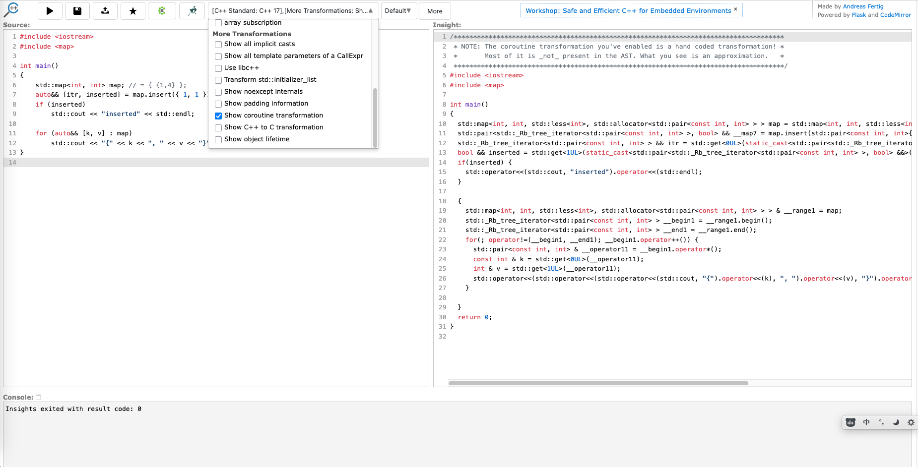 * C++ Insights:也是编译工具,但不是生成汇编代码而是 C++ 表达的中间代码,可以用来查看 C++ 编译器底层做的一些工作,对于本文的主题 C++20 协程至关重要