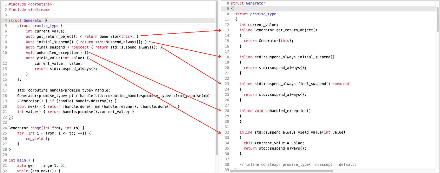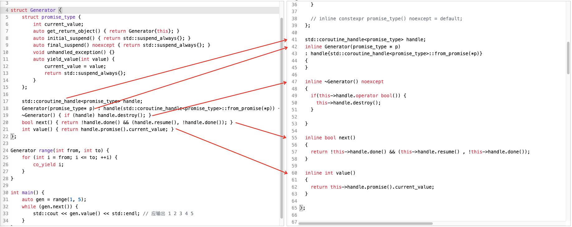 所以 yield 其实就是函数 return,而协程本质就是函数+状态机,这个之前文章里都已经说过了,那 C++20 协程有本质不同吗?答案是没区别。下面来看一个典型的 C++20 协程例子,并根据编译器中间结果来印证上面的结论。