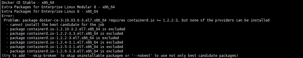 这是由于CentOS8的yum默认安装了containerd.io的1.2.0-3版本,不支持新版docker我按照网上指定版本的方法: